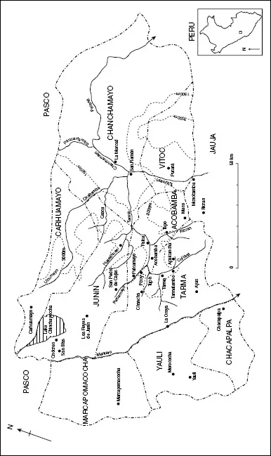 The province of Tarma lies on the eastern slopes of the Andean Cordillera, its capital some 130 miles by road due east of Lima and the Pacific coast. To reach Tarma, one has to climb up the arid mountains, pass the high-altitude mining zones of Morococha and Yauli (former districts of Tarma province), and then descend by a steep, winding road to temperate eastern valleys. (Map 1.1 shows Tarma province with the boundaries of 1900.) The town of Tarma lies at an altitude of 3,000 meters, on the road down to the tropical lowlands of the upper Amazon basin. The town is located at the upper end of a highly productive, irrigated, arable, valley heartland, where potato and maize lands meet. The indigenous-mestizo peasantry had held onto much of the land in the valley floors. In the highlands above, pastoral and potato-growing haciendas belonging to descendants of colonial propertied families formed a ring. To the north of Tarma province, we find the wealthy mining center of Cerro de Pasco and to the south the prosperous Mantaro valley and towns of Jauja, Concepción, and Huancayo.