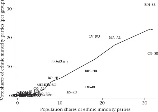 Central and eastern Europe is well suited for testing a âproportionalistâ vision of ethnic accommodation for a number of reasons. First of all, the region is highly ethnically diverse and has a history of ethnic conflict (Brubaker, 1996). Also, while the countries studied in this book either use proportional representation or mixed electoral systems (Shvetsova, 1999; Tiemann, 2006), electoral thresholds vary widely enough to test the influence of electoral rules on representation; there are many cases of ethnic minorities without their own ethnic parties or ethnic representation; and in some cases descriptive representation has been associated with stability and in others with conflict (Birnir, 2007, p. 3). Taking these observations together, the puzzling question is not only whether and when descriptive representation does more good or harm, but also why only some, and which, groups are exactly represented descriptively. This calls for contextual or group-level explanations, in particular as for example the vote shares obtained by ethnic minority parties are only partially explained by their population shares (see Figure 1.1). Hence, in addition to testing the consequences of descriptive representation for ethnic conflict, parts of the book are dedicated to the explanation of levels of ethnic-partisan representation.
