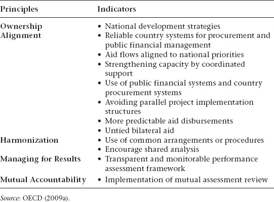The Paris Declaration was a result of a major international effort to improve aid effectiveness, with more than one hundred donors and partner countries signing on to commit to major reforms in aid delivery. As summarized in Table 1.1, they agreed on five principles: ownership, alignment, harmonization, managing aid for results, and mutual accountability. They also came up with twelve indicators to measure aid effectiveness.