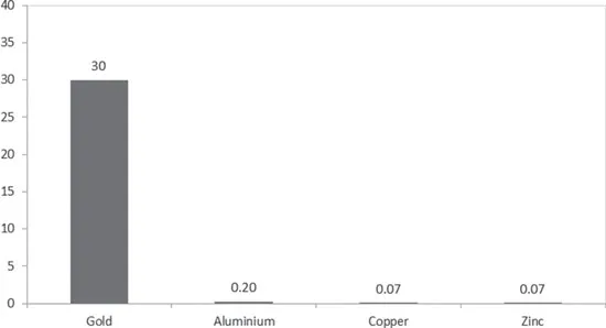 The foregoing points to an important difference to other commodities, for only in silver is this store of value function otherwise found to a noteworthy extent. It is estimated that up to today approximately 170,000 tons of gold have been mined1 and that most of it still exists in accessible form. By contrast, annual mine production amounts to approximately 2,800 tons at the time of writing, with annual consumption (industrial demand, jewellery fabrication, dentistry) amounting to perhaps 2,400 tons. Thus, the total supply of gold mined to date amounts to about 70 times the amount consumed annually. That is an extraordinarily high ratio of stocks to flows. While inventories of other commodities usually last only for months, one could stop gold production for many years and still be able to satisfy consumption demand. Of the two most important monetary functions, gold has, after all, only lost its usefulness as a medium of exchange; it has retained its function as a store of value. Figure 1.1 shows the ratio of inventories to annual production of various metals. Even though the values are only estimates, are highly variable depending on the business cycle and partly depend on definitions (is jewellery part of the stock, or is it part of what has been consumed?), they nevertheless make the extraordinary role of gold compared to other commodities plain. The chart is meant to clarify this state of affairs (only half of all the gold ever mined is assumed to be part of the available stock).