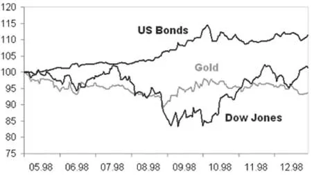 Between mid-July and the end of September 1998 stocks in the USA fell by approximately 20 per cent. During the same period, treasury bonds rose massively, as they were regarded as a safe haven. And what happened to the gold price? Overall, it barely moved; it even fell intermittently! It was as though gold were not a safe investment, but rather just as unsafe as the debt of a dubious borrower. The chart depicted in Figure 3.1 shows the performance of an ounce of gold in US dollar terms, of an investment in ten-year treasury notes and of the US stock market, represented by the Dow Jones Industrial Average during the crisis.