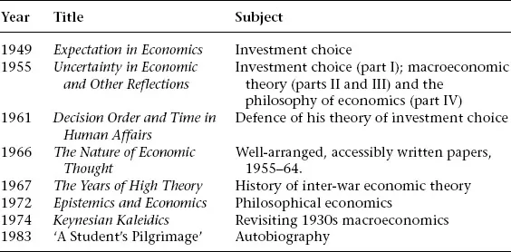 Shackleâs scholarly works are conveniently listed in Stephen (ed.) (1985, pp. 107â12), Frowen (1990, pp. 197â209) and Shackle (1990b, pp. 243â54), and the contents of the archival material housed in the library of the University of Cambridge are listed by Cann (2000).1 In an autobiographical piece Shackle (1992, p. 510) listed the works shown in Table 2.1 as his âmajor writingsâ.