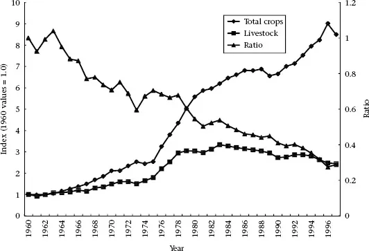 Figure 1.1 Price indexes of crops and livestock and the ratio of the two price indexes for 1960–97 at 1985 prices