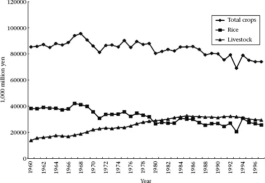 On the other hand, the prices of livestock products were stagnant from the late-1970s. This may reflect the drastic increase in the supply of milk due mainly to the scale enlargement of milk production during the study period 1965–97. As a result, the terms of trade of livestock to crops declined consistently during the entire study period. Conversely, according to Figure 1.2, the total amount of crop production was stagnant or even had a decreasing trend, which seems to have been consistent with the movements of rice production. On the other hand, livestock production increased consistently from 1960 to around 1992, but after that it was stagnant or even slightly decreasing. However, it is noted that the amount of production of livestock has surpassed that of rice since as early as 1980.