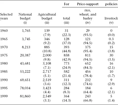 (3) Figures in parentheses in column (iv) are the shares of the budget for price-support policies for rice, wheat, and barley in per cent.