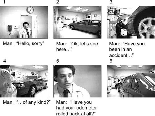 Cohesive devices and cohesive patterns can also be applied to moving images. This, and the empirical issues filmic cohesion can approach, will be the main tasks taken up in this book. In the remainder of this section, therefore, I briefly exemplify the application of cohesion analysis to moving images to set the scene for what will follow. Consider the filmic extract portrayed in Figure 1.2. Here we see the first six shots of a TV commercial that is attempting to communicate to the viewer how trustworthy the service of the company is. Upon seeing the image and the dialogue, the viewer readily grasps the story event as âa man talks to a car about some thing/symptom it hasâ.