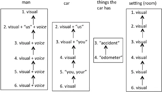 For instance, the content of the above extract concerns the man, the car, the things the car has (odometer, accident) and the overall setting. Like the tracking of âthe presidentâ in Figure 1.1, how the four elements are tied together throughout the extract can be set out usually in cohesive chains as is displayed in Figure 1.3. The cluster of âmanâ in the figure indicates that he is represented cross-modally in most of the images. Apart from being represented in the visual track, after his voice is associated with his identity the audio device of voice also tracks his identity over the extract. In image 2 his identity is realised in three modes (with visual, audio and the verbal text âusâ, when he says âLetâs see . . . â). So is the car, which is presented cross-modally both in the visual mode and in the verbal text âusâ (also in the manâs spoken text âLetâs see . . . â) in image 2, as âyouâ in image 3 and mono-modally referred to as âyou, yourâ in the manâs spoken text in image 5.