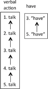 Figure 1.5 Event patterns of the extract in Figure 1.2 constructed by interlinking the cohesive identity patterns (Figure 1.3) and the cohesive action patterns (Figure 1.4) of the salient characters, objects and setting