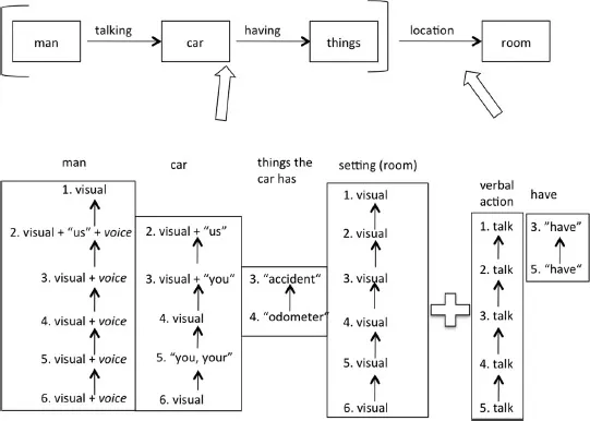 Returning to the TV commercial, apart from character (man), object (car and things the car has) and setting (room), it is also useful to track salient actions or movements associated with these. In this example, the most salient action interlinking the man and the car is âtalkingâ (by the man to the car), while the relation between the car and âthe things the car hasâ is the semantic tie of âhavingâ, spoken by the man in his verbal text in image 3 and image 5. These two salient semantic relations can also be cohesively tracked and patterned as displayed in Figure 1.4.