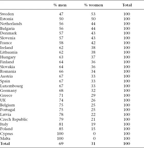 The proportion of women, higher than in most national parliaments, doubled between 1979 and the last two EPs: 16 percent in 1979, 31 percent in 2004 and 35 percent in 2009. If the EP is one of the most feminized parliaments in Europe (Kauppi, 1999; Beauvallet and Michon, 2008), it has not yet achieved gender parity. Major variations remain among countries, indicating important differences among national political systems. There are few female MEPs from Cyprus, Malta, Poland, Italy, the Czech Republic and Latvia. Women are better represented in Sweden â the only country where parity is achieved â and in the Netherlands, Denmark, Estonia, Slovenia and France, where more than 40 percent of MEPs are women (Table 1.2).