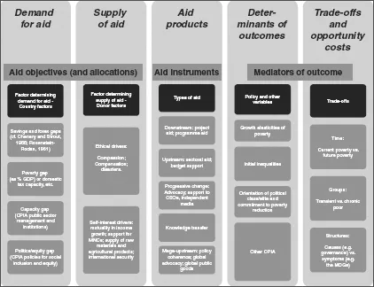 One could argue that the global aid market is constructed around the interaction of five stylised aspects: the demand for aid; the supply of aid; aid âproductsâ or instruments; aid effectiveness determinants; and trade-offs or opportunity costs (see Figure 1.1). We deal below directly with the demand for and supply of aid, and discuss aid instruments and issues around the domains of aid utility and trade-offs throughout this book.