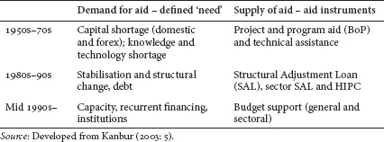 Such an approach resonates with Kanburâs (2003: 5) discussion of the history of aid and the shifting demand for, and supply of, aid over time (see Table 1.1).