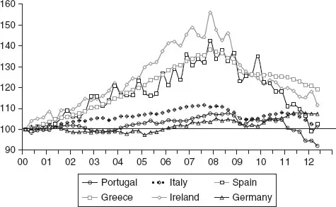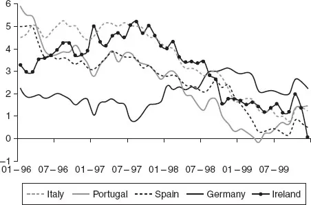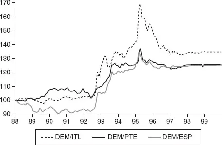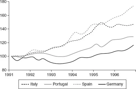 The euro was seen as instrumental in eliminating the risk of competitive devaluations and possible protectionist pressures, obviously something that would not be welcome in a deep integrated single market with freedom of trade in goods and services and capital movements. History shows that European countries have repeatedly shown little appetite for floating exchange rates. Following the collapse of Bretton Woods, they launched the “snake”, then the European monetary system (EMS), a regime of fixed but adjustable exchange rates. When the EMS collapsed in the early 1990s, with huge exchange rate adjustments (Figure 1.1), considerable changes in exports performances followed (Figure 1.2). Beside political considerations, such disturbances were a good argument in favour of a single currency, a much more robust arrangement than a classic fixed exchange rate regime.