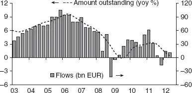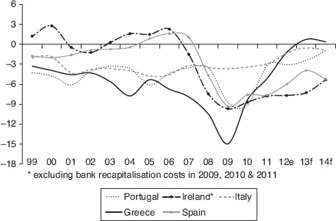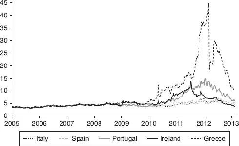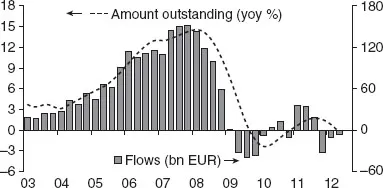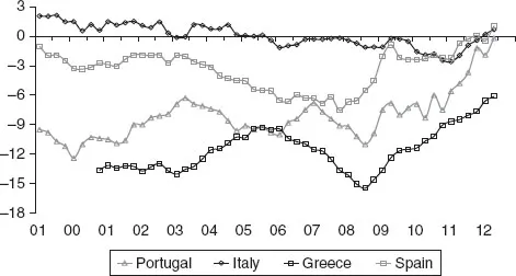 The widening of external deficits (Figure 1.9) and expansionary fiscal policies in some “peripheral” ’ countries (Figure 1.10) continued for as long as investors had an appetite to lend (Figure 1.11). That might not have been an issue had the deficits been related to productive investment that would have generated income in the future. But in the case of many countries, the deficits were due to increasing government expenditure and/or excesses in the private sector, especially in residential construction.