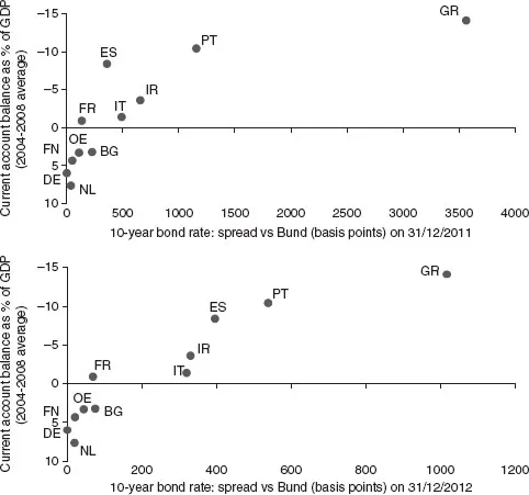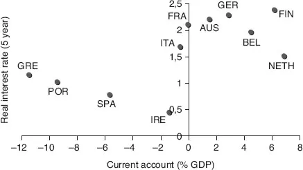 Finally, access to external finance became a problem. Countries that experienced low real rates exhibited large current account deficits (Figure 1.12). When the crisis erupted, countries with a large current account deficit were then affected by high spreads (Figure 1.13).