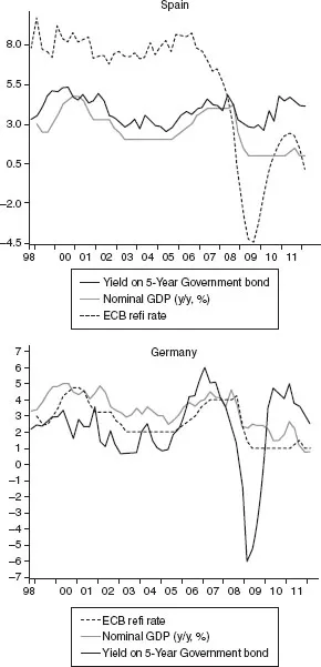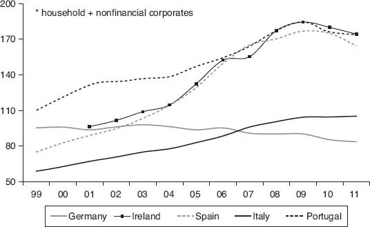 Countries that had previously experienced high interest rates benefited from much friendlier financing conditions with real rates much below growth, especially in the south of Europe. By contrast, financial conditions in Germany were restrictive (Figure 1.4). So a borrowing binge erupted (Figures 1.5 and 1.6). This resulted in elevated debt ratios, especially in the private sector (Figure 1.7), where domestic demand was strengthened (Figure 1.8).