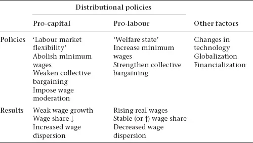 Income distribution is the outcome of complex social and economic processes, but governments directly influence it by means of tax policy, social policy and labour market policy. As shown in Table 1.1, we define as pro-capital distributional policies those policies that lead to a long-run decline in the wage share in national income, while pro-labour distributional policies are policies that result in an increase in the wage share. Pro-capital distributional policies usually claim to promote ‘labour market flexibility’ or wage flexibility, rather than increasing capital income. They include measures that weaken collective bargaining institutions (by granting exceptions to bargaining coverage), labour unions (for example, by changing strike laws) and employment protection legislation, as well as measures (or lack of measures) that lead to lower minimum wages. There are also measures that alter the secondary income distribution in favour of profits and the rich, such as exempting capital gains from income taxation, or reducing the corporate income tax. Ultimately, pro-capital policies impose wage moderation.
