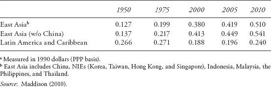 Since 1950 these two regions have followed very different economic trajectories. At the beginning of the period, Latin America was the most important region in the developing world in terms of per capita income and the size of its manufacturing sector, while East Asia was relatively undeveloped. By the end of the past century, however, the relative positions of East Asia and Latin America (in terms of relative income per capita vis-Ă -vis the United States) had been reversed (Table 1.1). In fact, during a 30-year period (from 1975 to 2005), Latin America fell steadily behind the income level of the United States, while East Asia surged ahead.