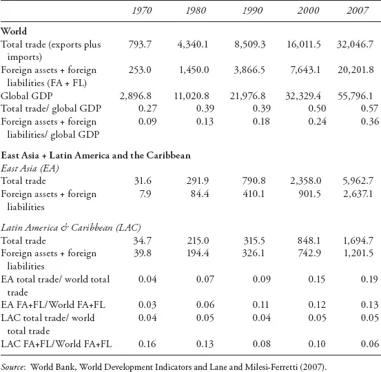 Over the past 30 years or so, a rising share of international trade and investment has been dominated by the activities of large multinational or transnational corporations, which at the turn of the past century accounted directly for around one-third of global trade in the form of intra-firm trade, and roughly two-thirds of global trade in transactions with other entities.10 According to recent UNCTAD estimates, an even higher share of global trade in exports (around 80 percent) is linked to the global production networks managed by multinational corporations as either intra-firm or arms-length trade. The flows of global trade accelerated sharply during the second half of the twentieth century, and in particular since the 1970s. The value of exports and imports as a percent of global GDP has more than doubled from around 27 percent in 1970 to 57 percent in 2007 (Table 1.2). At the same time, financial globalization, as measured by the ratio of foreign assets and liabilities as a share of global GDP, has expanded by a factor of 4 between 1970 and 2007. Within these global trends, it is readily apparent that East Asia has achieved a much greater degree of integration into the global economy than Latin America.