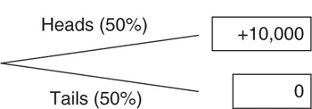 First, however, we must analyze the problem from the beginning. To do that we must invite the reader to consider a relatively simple (and perhaps somewhat unrealistic) lottery. Suppose we offer someone a ticket for a heads-or-tails lottery, with a perfectly legal, balanced coin, so that the chances of getting either heads or tails are equal. If the coin comes up heads, the bettor wins ā¬10,000, otherwise nothing. The possibilities are shown in Figure 1.1.