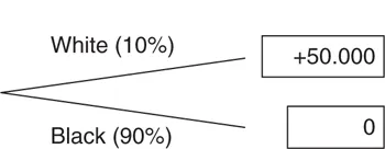If the probability of winning gets smaller and smaller but the expected value remains the same because the prize increases proportionately, the maximum amount people are willing to pay to participate in the lottery will naturally be less and less. Consider, for instance, a lottery in which a ball is drawn at random from an urn with nine black balls and one white one, with a prize of ā¬50,000 if the ball is white and zero if it is black (see Figure 1.2). The expected value is the same as in the previous lottery, i.e., the average winnings are ā¬5000 per draw (10% of ā¬50,000), but most people will be unwilling to pay as much for participating in this lottery as in the previous one, since the risk is greater: 90% of the time they will win zero and so will lose the amount they paid in order to participate.