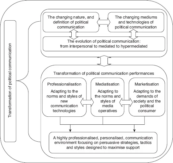 It is argued that political communication has gone through a process of transformation. The transformation is depicted in Figure 1.1, but the chapter contextualises the transformation within current literature and practices of political communication. Political communication is argued to have simultaneously passed through three interconnected processes: professionalisation, mediatisation and marketisation. These processes are argued to have shaped the strategies and tactics of political communicators and have had a profound impact upon the publicsâ levels of trust, engagement and participation. The professionalisation of political communication describes the way that politics has adapted to new forms and styles of communication and new means of transmission in order to reach their audience. It is argued that professionalisation is driven by media, and adapting to the communication forms of media; we find ourselves today in the hypermedia age, with the Internet competing against television as the prime vehicle for political communication. Whether this changes the substance of political communication, the content of the message or just the presentation style will be explored further in this chapter. Secondly, and related to professionalisation, we turn to mediatisation. Mediatisation describes the process by which political communicators adapt to the working practices and patterns of journalists and editors in order to gain coverage. The adaptation to the demands of the media is linked to, as well as in some cases competes with, the notion of marketisation. Scholars within the field of political marketing literature argue that, in terms of design of policy, messages and slogans, and the means of communicating, it is the market, the consumers or audience that hold the power. All communication is thus highly strategic, designed with impact in mind, and these broad theories that help to explain the development of political communication will be used to contextualise cognition and the processes by which we receive political communication and what impact it has upon us.