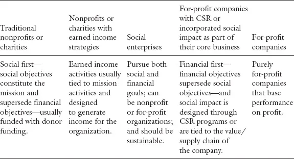 The growth of the social enterprise economy in the past two decades is due to its success in addressing entrenched social and economic problems. The persistent problems of unemployment, poverty, social exclusion, poor social services, and environmental degradationâeven in fast-growing emerging market economiesâcall for new, innovative solutions. Neither pure market-based nor pure public-sector approaches have effectively confronted these problems. The former has tended to approach them as a side activity usually addressed through corporate social responsibility (CSR) programs, whereas the latter has tended to create programs with an overemphasis on subsidizing services for a set number of beneficiaries rather than improving the root causes of poverty and exclusion. Table 1.1 demonstrates where social enterprises fall in the spectrum related to social and financial objectives. Social enterprises are at the center of this spectrum, where social objectives supersede financial objectives, but where financial objectives are key for long-term sustainability and growth.