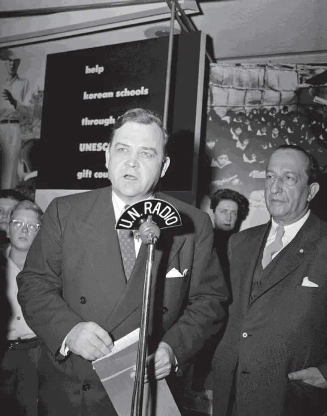 Figure PI.1 Director-General Luther H. Evans makes a radio broadcast in October 1954 during which he presents a gift for the UN Korean Reconstruction Agency. The collected funds were used to establish a UNESCO childrenâs ward at the Tongnae Rehabilitation Centre in Korea. (© United Nations)