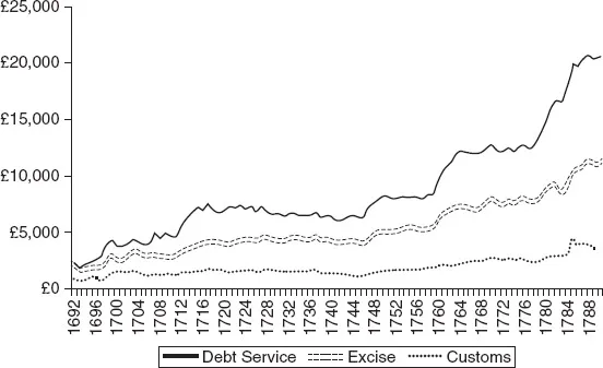 Figure 1.1 Excise and customs revenues versus debt service charges, 1690â1790