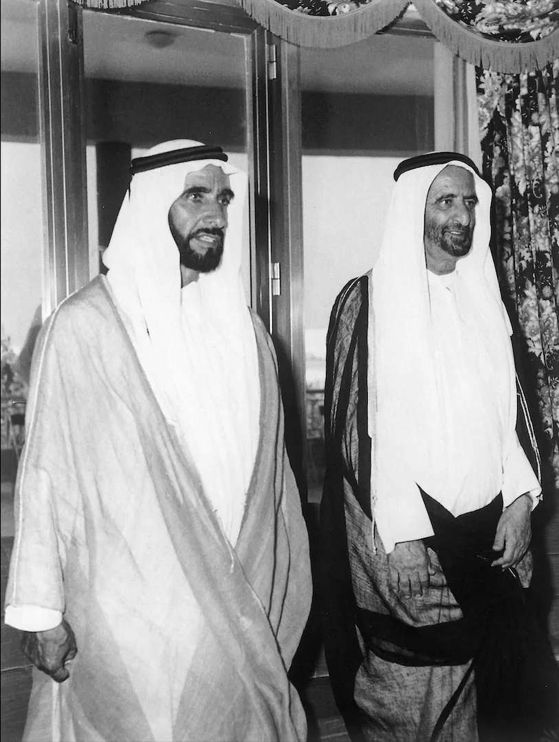 Sheikhs Zayed bin Sultan Al Nahyan and Rashid bin Saeed Al Maktoum, Life-long companion in the path of the union. āSource: Al-Khaleej newspaperā