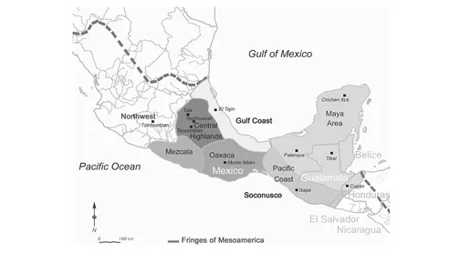 Mesoamerican civilization looks back to a continuous occupation of several thousand years. Here, incipient agriculture began almost ten thousand years ago, defining the Archaic period (BC 8000â2000), which led to the establishment of sedentary agricultural villages (Prufer et al. 2014). The two thousand years that encompass the Formative period (2000 BCâAD 250), saw the rise of first hierarchically organized social organizations. These were noticeably the Gulf Coast Olmecs that extended ties with other peoples north along the coast and towards the Highlands, the Maya area and southwards across the Isthmus of Tehuantepec. These networks, together with the beliefs and rituals that accompanied them, laid the basis for subsequent Mesoamerican cultural evolvement during the Classic period, which roughly spans the first millennium ad. The Early Classic was dominated by Teotihuacan and Monte AlbĂĄn in Central Mexico and Lowland Maya society to the east. The latter was organized along extended family relationships and as territorial units. The political landscape was dynamic, as the distribution of power fluctuated, as the dynastic histories of all major centers among the city-states show. Maya leaders were related through family ties, which were constantly reinforced through strategic marriage bonds (Martin and Grube 2008; Martin 2020).