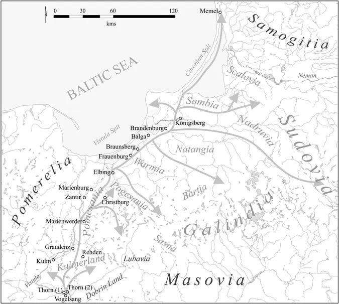 FIGURE1.2 Prussian tribal territories and the path of the thirteenth-century crusades (redrawn aft. Biskup et al., 2009)
