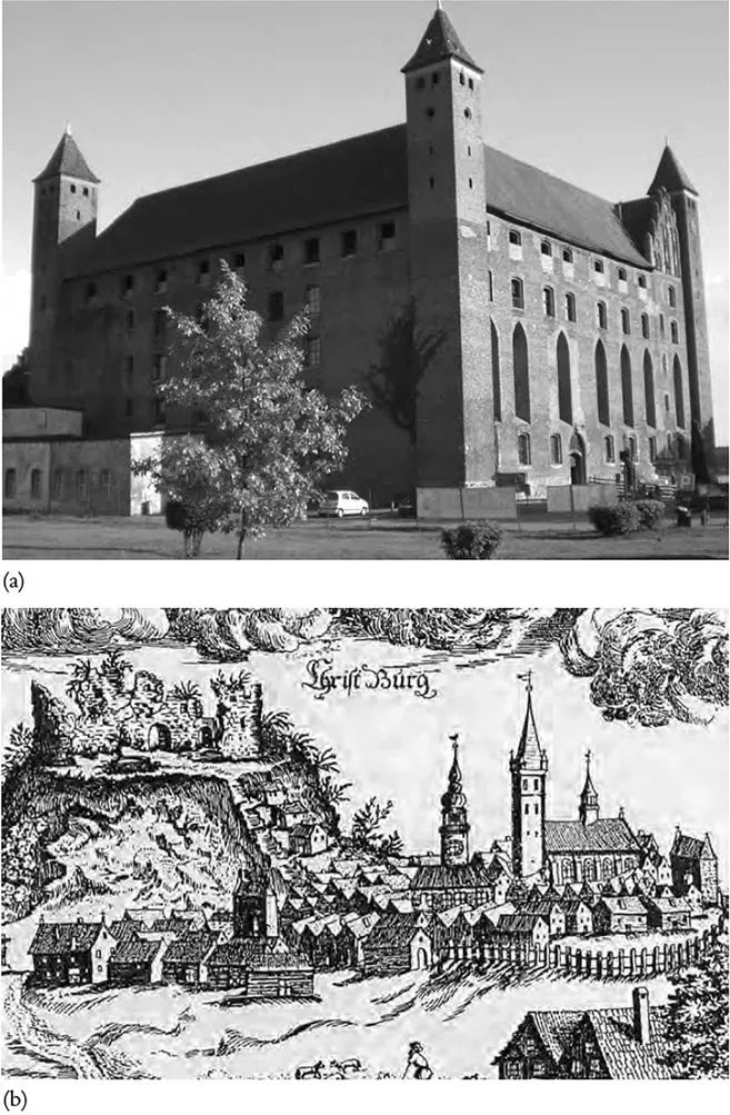 FIGURE1.3 The castle at Gniew (Mewe) (a) and the ruins of the castle at DzierzgoĹ (Christburg) as drawn by Hartknoch in 1684 (b)