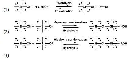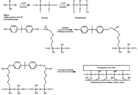 (a) Hydrolysis and condensation of silane (trialkoxysilane with R' functional group) and creating polysiloxane (b) reaction of Bisphenol A with the epoxy-functional group of hybrid sol (with siloxane), (c) curing and coating thin film on the substrate [122].