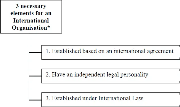 *Based on the following definitions: ‘The term “international organisation” means a collectivity of States established by treaty, with a constitution and common organs, having a personality distinct from that of its member-States, and being a subject of international law with treaty-making capacity’ (Special Rapporteur G Fitzmaurice, Yearbook of the International Law Commission 1956, Vol II, 108); ‘For the purposes of the present draft articles [ie the draft articles on the Responsibility of International Organisations], the term “international organisation” refers to an organisation established by a treaty or other instrument governed by international law and possessing its own international legal personality. International organisations may include as members, in addition to States, other entities’. (International Law Commission, Report of the 55th session (2003), UN Doc A/58/10, 38). Also see H Schermers and N Blokker, International Institutional Law: Unity within Diversity, 5th edn (Leiden, Martinus Nijhoff Publishers, 2011) 21–36, which establish basically the same three criteria.