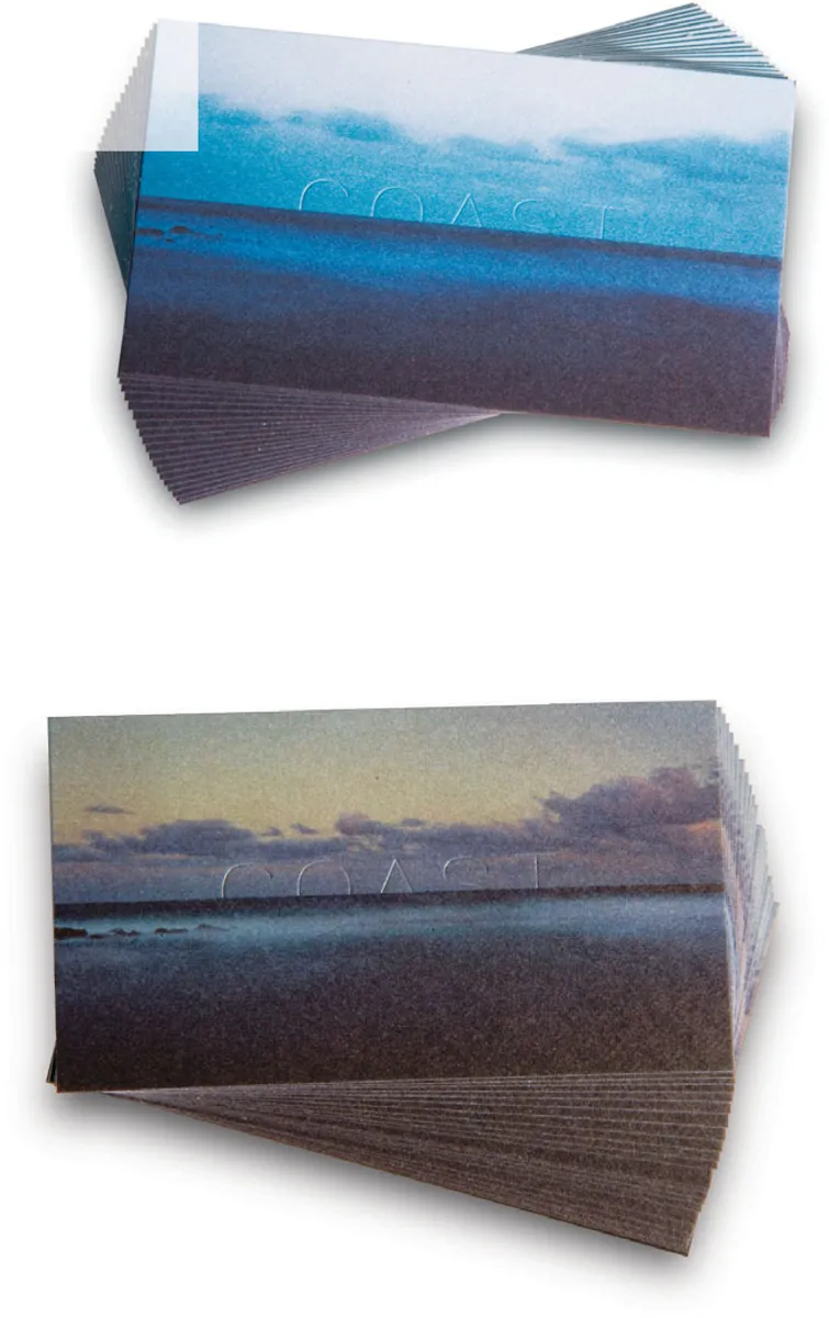 These business cards by Frost*, for restaurant Coast, feature a blind deboss, strategically placed on the horizon of the image. The accompanying invitation can be seen here.