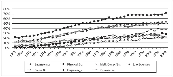 The most significant change in the graduate student body is that women are now as numerous as men. Indeed, gender parity in graduate education is one of the remarkable accomplishments of the past forty years. In 1966, just 12 percent of all American doctorates were awarded to women.2 By 2008 that number had soared to over 50 percent.3 There have also been impressive gains for minority students, particularly minority women, but they still are by no means proportionally represented. Moreover, the gender balance remains more uneven in some disciplines than in others. In 2008, women received only 28 percent of the doctorates awarded in the traditionally male-dominated physical sciences, including computer science and math, and just 22 percent of those awarded in engineering.4 Although these are lower proportions than seen today in the more human-centric disciplines such as biology and psychology, they nonetheless represent extraordinary progress. As figure 1.1 shows, over the past four decades the proportion of women Ph.D. recipients has increased more than a hundredfold in engineering, twelvefold in the geosciences, and sevenfold in the physical sciences. Since these trends appear unabated and women are outperforming men at the baccalaureate and master’s levels, it seems reasonable to assume that further gains will occur.5