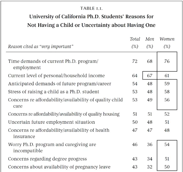 According to our survey of University of California Ph.D. students, only 14 percent of men and 12 percent of women are parents.14 Yet over two-thirds of the women claim that between twenty-eight and thirty-four would be the optimal age to have a first child.15 Why do most women avoid having children during graduate school? After all, it’s a time of flexible schedules and the possibility of a community with which to share the experience of parenting. The most common reason provided by our University of California respondents is the workload, as table 1.1 shows. Sixty-eight percent of male students and 76 percent of female students cite graduate school work requirements as the most important reason to hold off on children; women are also far more likely than men to believe that graduate school and parenthood are fundamentally incompatible.