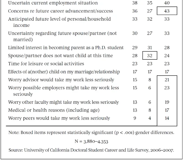 It is worth noting that women are more likely than men to put off having children for the same reasons that one of the authors of this book, Mary Ann Mason, did more than thirty years ago: they fear that they will not be taken seriously and that their professors and future employers will disapprove. One student at the University of California commented on her department’s attitude toward pregnant students: “There is a pervasive attitude that the female graduate student in question must now prove to the faculty that she is capable of completing her degree, even when prior to the pregnancy there were absolutely no doubts about her capabilities and ambition.” According to table 1.1, two to three times more women than men were concerned that having a child would be negatively perceived by their professors or future employers.