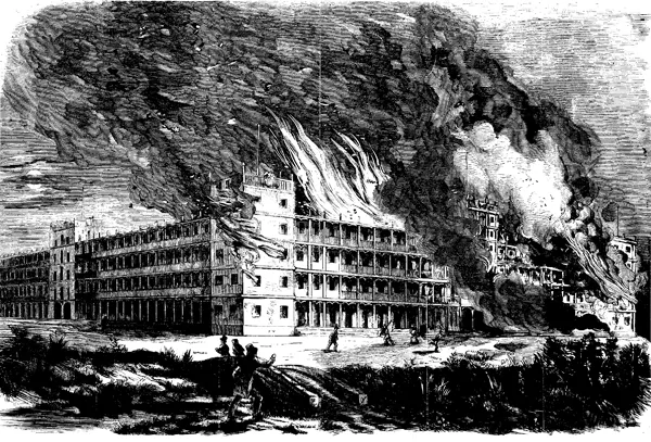 The United States Hotel, sold only the week before to a New York investor for $80,000, stood directly in the path of the fire, protected by a twenty-seven-thousand-gallon water tank and a corps of employees determined to save it. They hung wet blankets over the balconies facing nearby burning buildings and played almost all of their precious water on surrounding structures, but the intense heat and smoke proved too much for the hotel employees. Forced to retreat, they could only look on helplessly as the wooden structure first smoldered and then burst into flame. Wind-driven sparks soon ignited the American House and the New Atlantic Hotel, together with a score of lesser buildings in between. When it became clear that the United States Hotel was doomed, “the guests hurriedly poured out in a great crowd, men, women and children, scarcely clothed, and unnerved by fright,” reported the New York Times. “Each person was burdened with such articles of personal property as he had been able to snatch up in the hurry and terror of the moment; men bore out trunks, and women and children struggled under unwieldy loads of clothing. But there was little time to save property, and hardly more than enough to make sure that no human being should be swallowed up in the hot fire.”