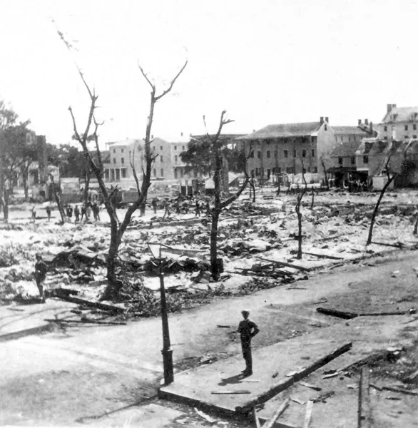 Disaster struck once again on August 31, 1869, the very year that President Ulysses S. Grant vacationed at the United States Hotel. It was 2:30 in the morning when the dreaded flames were first discovered flickering in a two-story building occupied by Peter Boyton, known locally as the Pearl Diver. Packed with flammable material, including Japanese paper kites and lanterns, lacquer boxes, and cotton goods, Boyton’s shop was soon burning fiercely. A handful of would-be firefighters who, acting without direction, broke in windows and knocked down doors unintentionally vented the fire, which then spread relentlessly from one building to the next. The town’s hook and ladder truck arrived, along with the mayor, W. B. Miller, who attempted to bring some order out of confusion, but the uncoordinated efforts of a thousand or more volunteers were no match for the fire, which had now gained an insurmountable headway. Unfortunately for the city, the wind, stirring only lightly when the fire began, now began to blow briskly toward the ocean, carrying sparks and flames to all of the buildings east of the Pearl Diver.