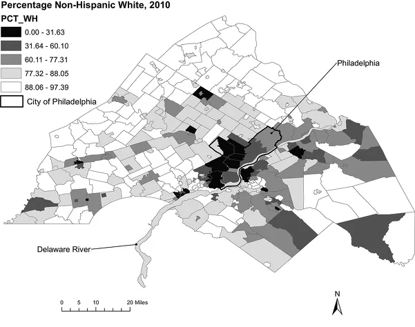 To trace communities through history, it is necessary to choose a definition of “community” that carries with it some type of social identity and sets it apart from other communities. Municipalities (boroughs, cities, and towns) have a social identity, including social class and racial/ethnic identities; and they specialize in certain types of employment. They also have legal boundaries, clear borders that set them apart from other places. Thus, communities outside Philadelphia are defined as the 339 boroughs, cities, and townships bordering Philadelphia but outside its boundaries. Within the city, it was a bit more difficult to define “communities.” Census tracts did not qualify, as they have no social identity; they were also much smaller than suburban towns. Neighborhoods were better than census tracts, since they have strong social identities; but like census tracts, they were too small in area to compare with suburban towns. Also, in Philadelphia neighborhood residents debate and disagree about the boundaries of their neighborhoods—in fact, there is even disagreement over how many neighborhoods actually exist in the city. The best definition for communities was the twelve Planning Analysis Areas used by the Philadelphia City Planning Commission, each of which contained more than one neighborhood.2 (See the appendix for a more detailed description of methodology.) Census data were added to maps of the twelve Planning Analysis Areas and the suburban towns that surround Philadelphia, yielding a picture of the racial/ethnic composition of all Philadelphia area communities and the median household income of each community (see maps 1 and 2).3