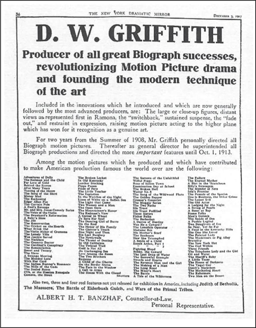 FIGURE 4: The 1913 New York Dramatic Mirror advertisement that publicly established D. W. Griffith’s credentials as a director of motion pictures.