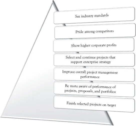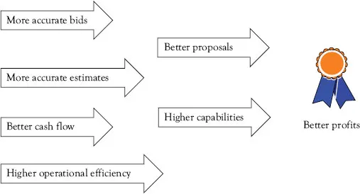 Sophistication in managing projects in and of itself should, and does, appeal to enterprises because it provides a point of pride among peers. However, project management sophistication has an enormous amount of operational practicality for creating improved organizational capabilities. In turn, operational efficiency has the practical advantage of providing the foundation of profitability, competitive edge, and first in class position (Figure 1.1).