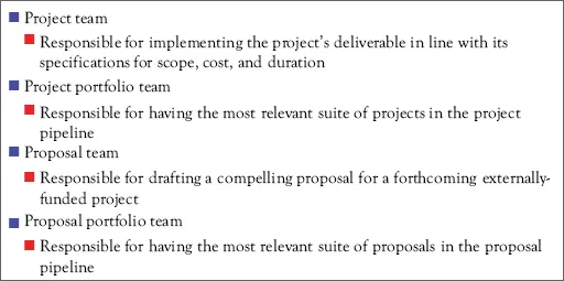 In sophisticated organizations, one would be able to identify the teams that are charged with handling different project management missions. Specifically, one would be able to find teams that manage individual projects, teams that manage portfolios of internally funded projects, and teams that manage proposals for externally funded projects (Figure 1.3).
