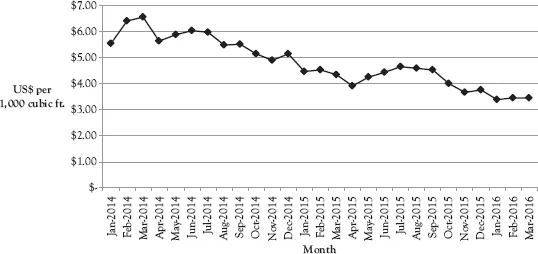 The next step in a technical analysis is to plot the historical price data and identify patterns. This can be done using a spreadsheet plotting the price data for the most recent two to three years in a line graph in the order of occurrence. This is typically represented as a time-series price chart. The monthly wellhead natural gas prices for 2014 to 2016 from the U.S. Energy Information Administration shown in Table 3.1 are plotted in Figure 3.1 to illustrate a technical analysis.