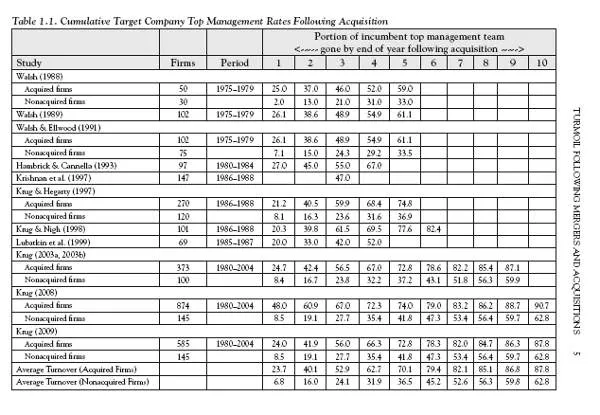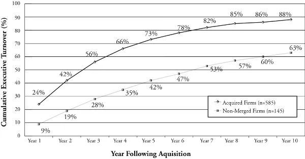 Based on survey responses, Walsh calculated cumulative top management turnover rates for each company in each of the 5 years following the target companyâs acquisition. He did not consider executives hired after the acquisition because his objective was to understand whether acquisitions lead to higher than normal turnover in the target firmâs incumbent top management teamâthose executives in place at the time of the acquisition. He found that an average of 25% of the target companyâs incumbent top management team departed in the first year after the acquisition. By the fifth year, 59% of the original top management team had departed.