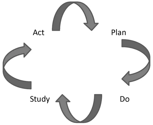 The basic idea behind the plan-do-study-act framework is that you start with your plan. Where do you want to go? Then you actually do something: You implement the plan. Following the implementation, you review or study your results to determine if the actions you took created the desired results. Following your review, you then adjust your plans or act upon the results of your study. This cycle then starts over again with the re-creation or modification of your plan (see Figure 2.1).