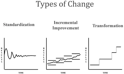 So for different types of changes, you will need different tools, approaches, and even language to lead the change. In the following sections, we describe three different approaches to change: standardization, incremental improvement, and transformation.