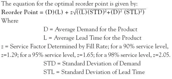 At the next level of complexity, these linear chains are viewed as a static stochastic system having constant means and constant standard deviations for demand, orders, and production. This statistically based view of the static supply chain resulted in several well-known optimization solutions such as the economic order quantity and optimum reorder points.1 These optimal solutions determine an ordering strategy that minimizes cost for an assumed level of customer service. The well-known equation for the reorder point, as shown here, includes the demand expected over the lead time as the key component and a safety factor that reflects uncertainty in demand and lead time.